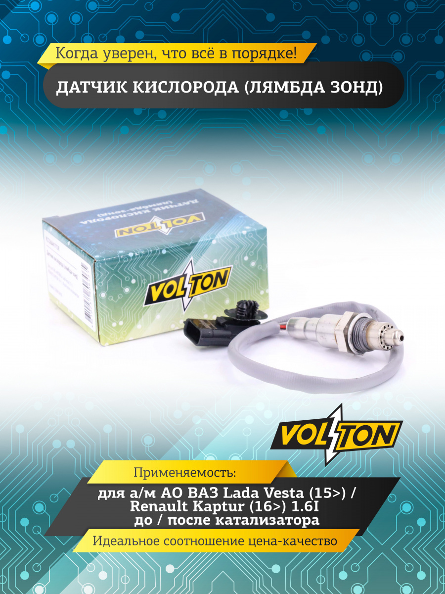 Датчик кислорода (лямбда зонд) VOLTON - проверяет количество несгоревшего кислорода в выхлопных газах автомобиля. Кислородный лямбда зонд подает электрический сигнал к ЭБУ, который оптимизирует состав топливно-воздушной смеси, подстраивая режим работы двигателя Все датчики кислорода VOLTON полностью соответствуют по посадочным размерам оригинальным изделиям. В Ассортименте представлены кислородные датчики двигателя для отечественных автомобилей, иномарок и коммерческого транспорта.