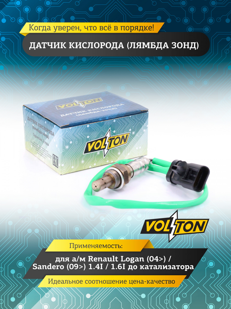 Датчик кислорода (лямбда зонд) VOLTON - проверяет количество несгоревшего кислорода в выхлопных газах автомобиля. Кислородный лямбда зонд подает электрический сигнал к ЭБУ, который оптимизирует состав топливно-воздушной смеси, подстраивая режим работы двигателя