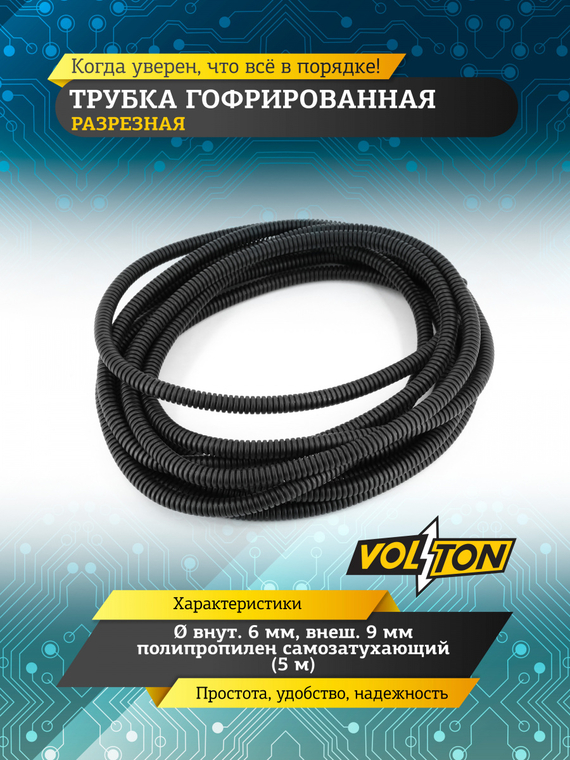 Трубка гофрированная разрезная,д внут.6 мм,внеш.9 мм полипропилен самозатухающий (5м), VOLTON